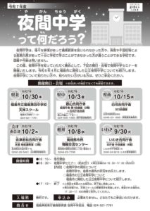 夜間中学とは、主に夕方以降の時間帯に授業を行う中学校です。